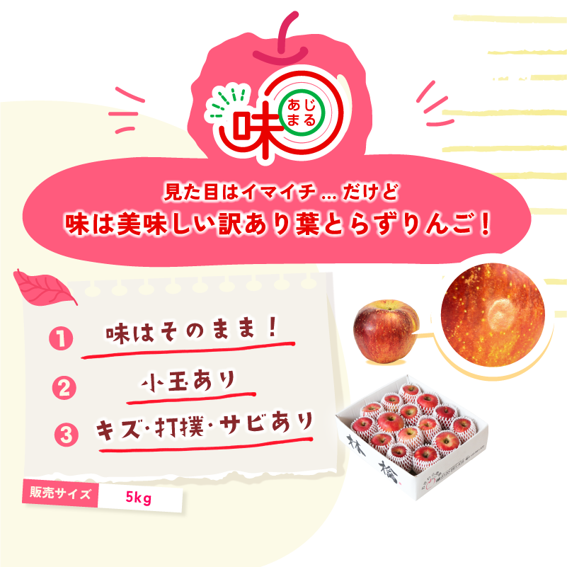 このような状況から、秋映、シナノスイート、サンふじにおいて、果面荒れや傷、小玉等、”見た目はイマイチだけど味は美味しい”りんごを『味◎(あじまる)』という名で販売することと致しました。