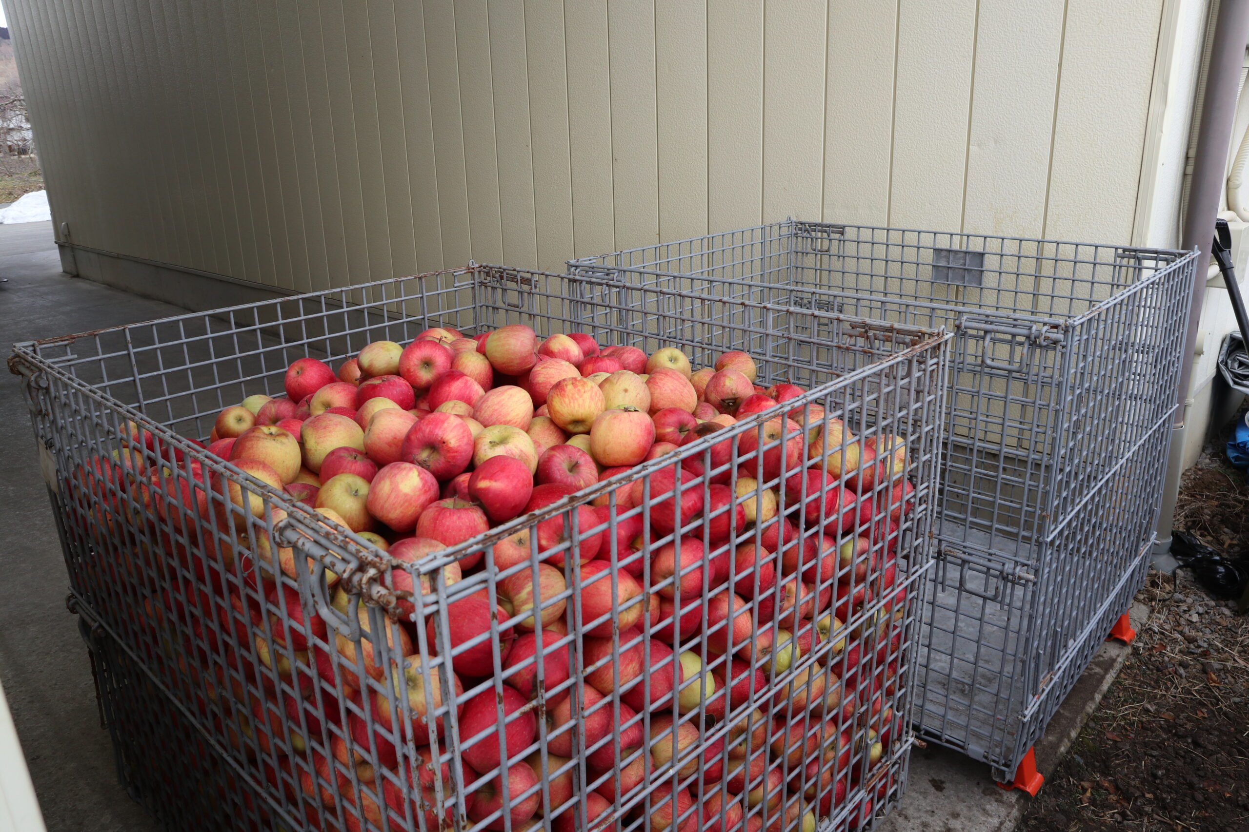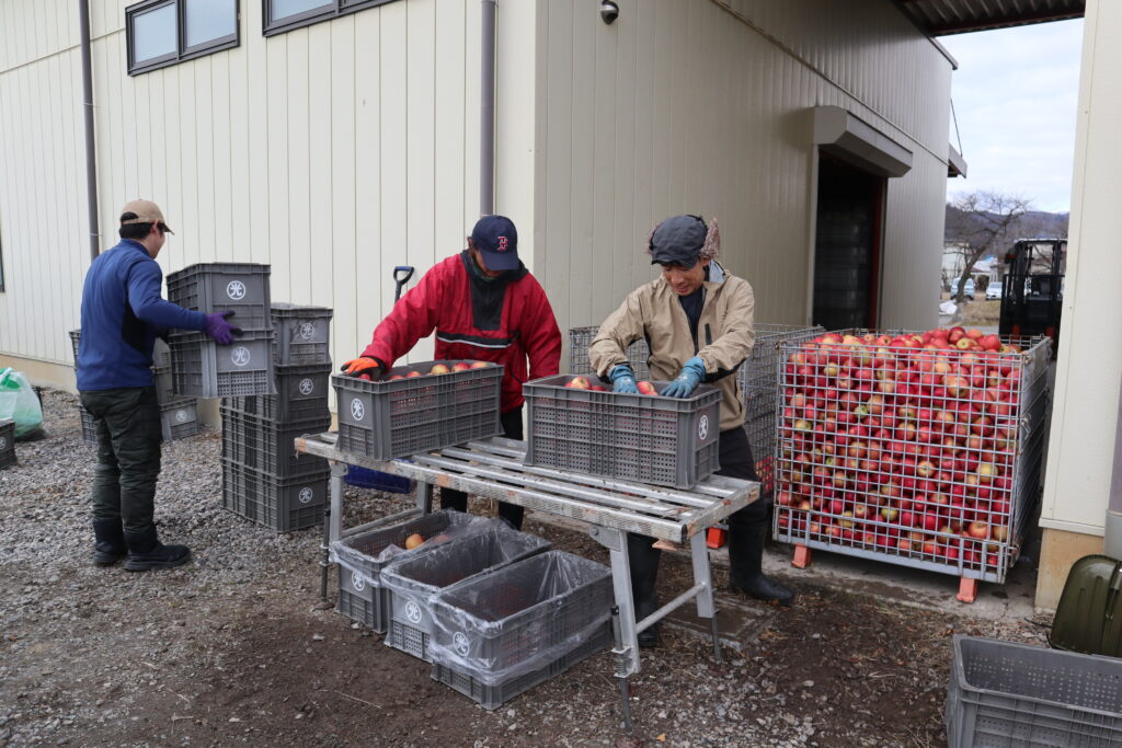 工場へ当園の加工用りんご(サンふじ)を専用のカゴへ移す作業なのですが、